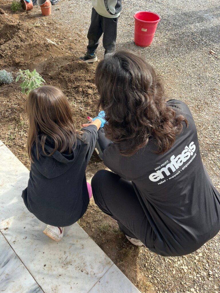 The floods caused significant damage not only to school buildings but also to outdoor areas that are essential for students’ well-being. The schoolyard in Glinos had lost much of its greenery, leaving the environment feeling bare and unwelcoming. Through this joint effort, we worked with volunteers, educators, and members of the local community to reintroduce nature into the school grounds by planting trees that will provide shade, improve air quality, and support long-term environmental recovery.