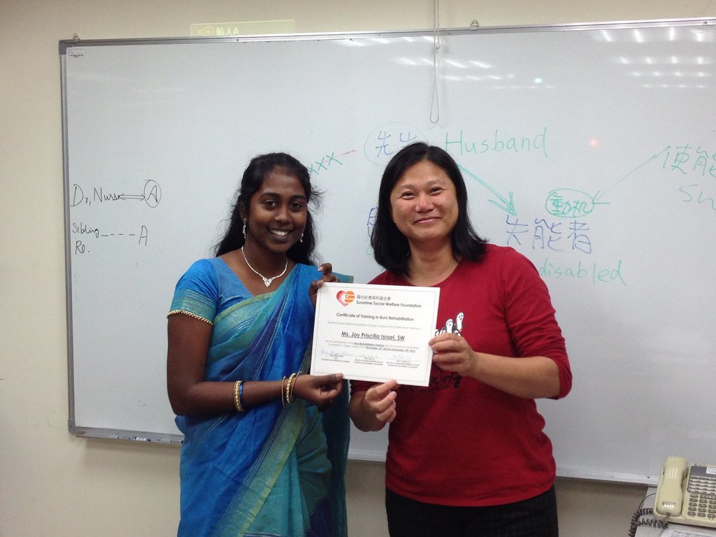 Sunshine Foundation initiated a three-year cooperation project in 2013 in Chennai, India to help a local organization set up a Care Center for women burn survivors. By training their staff in Chennai and holding internships for them in Taiwan, as well as providing continuous support through monthly SKYPE meetings, we are helping this local organization address an unmet need: provide comprehensive physical and psychosocial rehabilitation services for women burn survivors after hospital discharge.