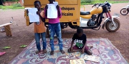 The mobile library in Houndé, Burkina Faso, known locally to the FAVL team as the BMP (Bibliothèque Mobile Penelope) has been on hiatus while the newly hired librarian obtains an official drivers license. The mobile library is built out of a "tricycle" (a large motorcycle with attached small library), and driving it is quite difficult, and all drivers must be licensed. (There are many accidents for these vehicles by young male drivers!). While we await his license (a process that takes several months as he must attend driver education classes, we are replenishing the inventory of books and games of the mobile library. We expect it to be ready to go in July.