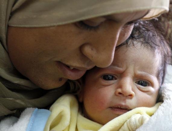Khloloud Mohammad, her husband and seven children braved shellings and snipers as they made the trek on foot to cross into Jordan. Seven months pregnant, Khloloud left Syria with her family to escape the violence. “All I want is to have a safe place for my children,” she said. Once in Jordan, the family was transferred to Cyber City, a rapidly expanding refugee center with a UNFPA supported mobile clinic. With the help of a quick acting midwife, Khloloud was able to deliver a healthy baby girl, Rania. When Kholoud went into labor there was not time to transfer her to a hospital so the midwife, “had no other option but to help her give birth at the clinic.”