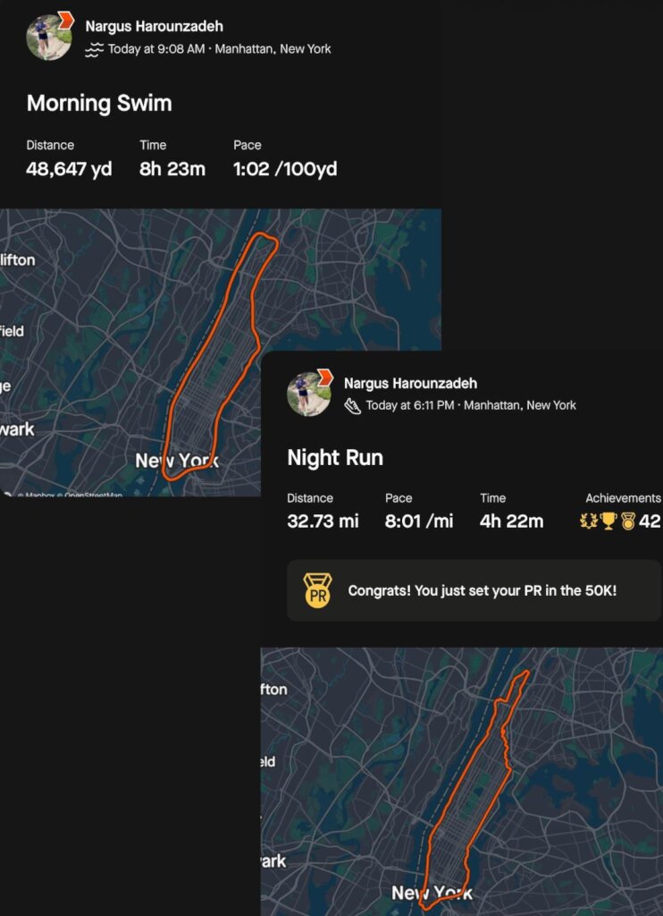 Nargus made records being the first person to ever complete a Manhattan ultra marathon swim run. Starting at 9am she swam in the Hudson river for 8 hours, 24 minutes and 20 seconds and then went on to run around the island in 4 hours 27 minutes and 21 seconds where she was met with her friends and family to congratulate her on her big win!.