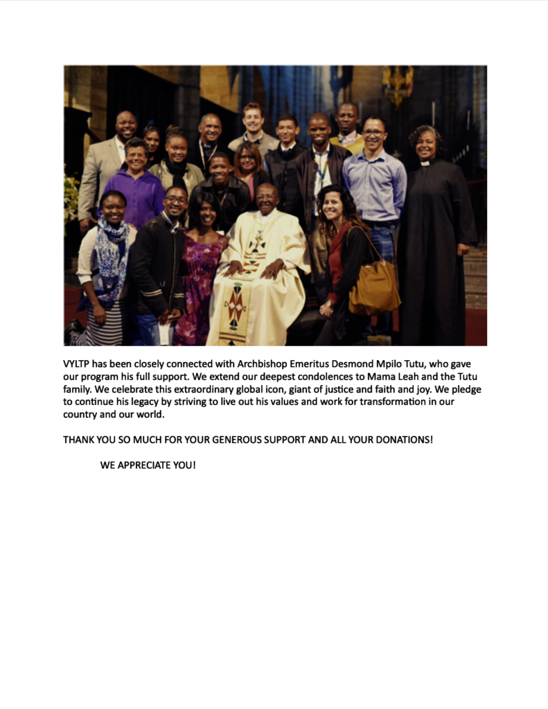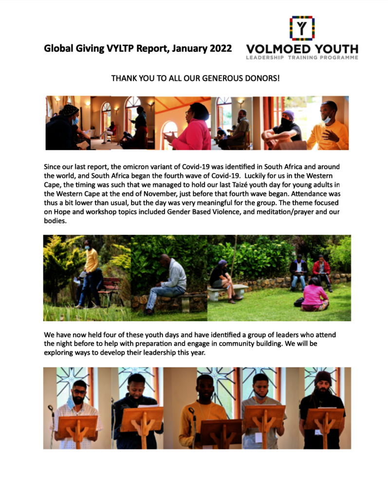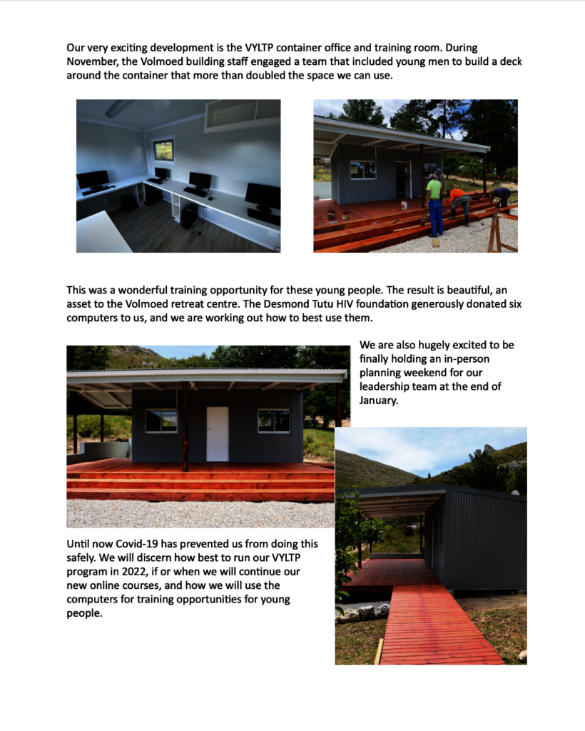 The VYLTP Leadership Team met in person at the end of January 2022 for the first time since 2019, and it was a joy to be together for a weekend. We evaluated what in the program is working and what needs working on; we clarified what our VYLTP alum and volunteer, Mona Nerea Okello, would do during her six weeks here at Volmoed; we explored the idea of housing small groups of volunteers here in order to do more in depth, longer training. We continue to follow up these ideas. Covid-19 has clearly been a negative impact on our program, but we are hopeful to hold an in person program before the end of 2022, even if it has to be shorter than our usual program.