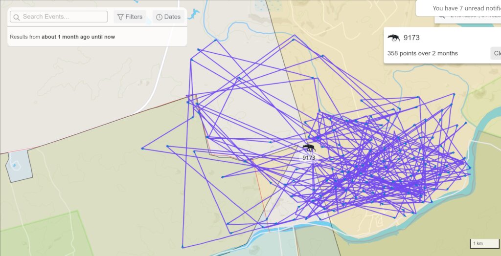 core home range covers an area of about 1200 hectares. We have determined where their den sites are and have installed trail cameras to monitor them, their cubs and the rest of their clan to check for any snares or snare related injuries popping up.