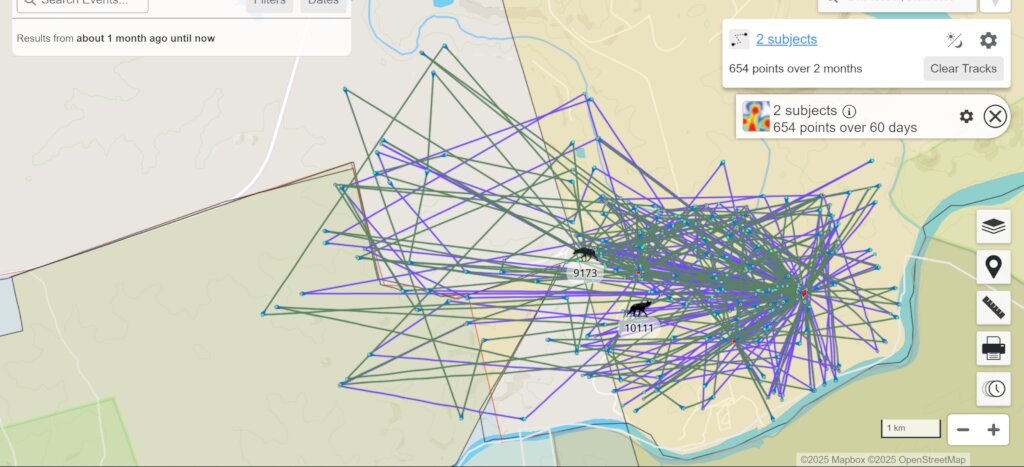 core home range covers an area of about 1200 hectares. Both females are currently denning and will have cubs soon.