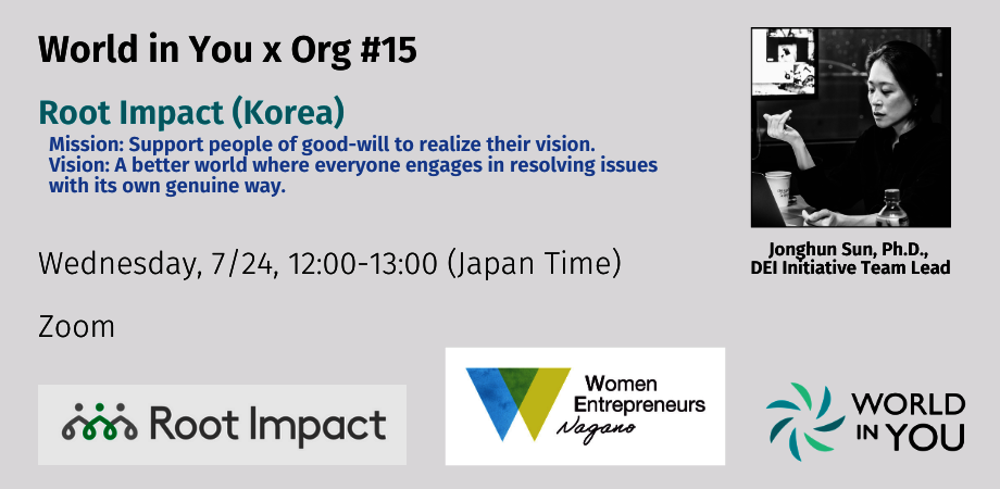 We are thrilled to invite you to our upcoming virtual event World in You x Org* #15 on July 23rd (US time)/24th(Japan time) with Dr. Jonghun Sun, the DEI Initiative Team Lead at the Korean nonprofit organization Root Impact. The event will be in English.
