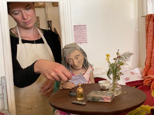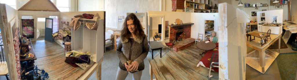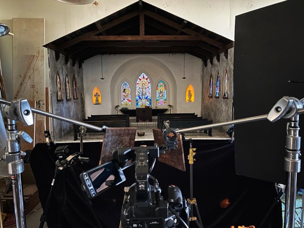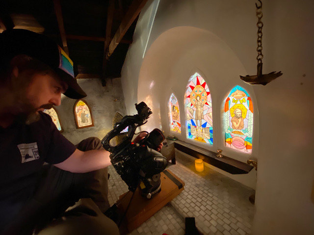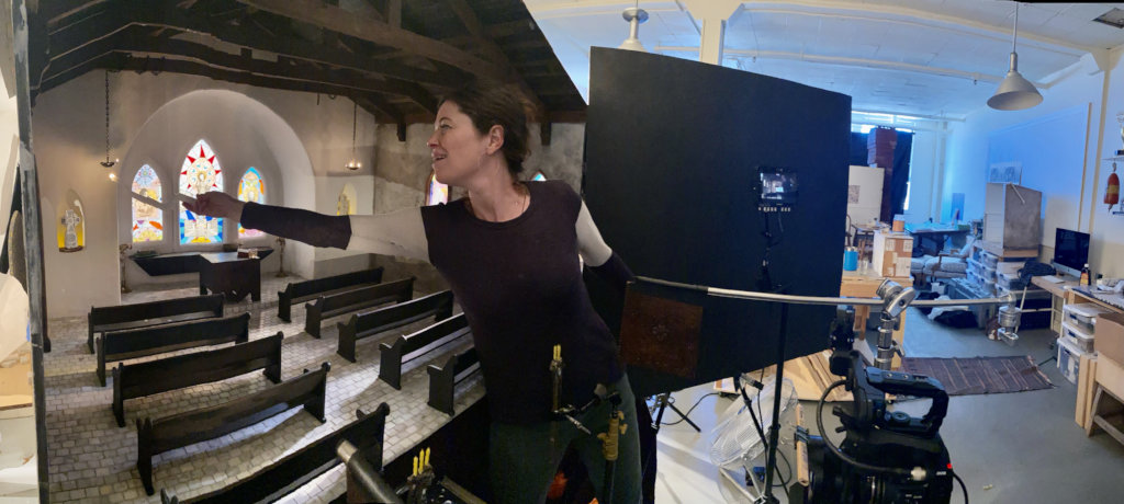 The long days of summer are finally here and they are especially welcome after a long dark winter. This spring we have been hard at work in our studio. We recently brought some ideas to fruition that we’re born before the pandemic began. Banker completed building a small church interior, based on the church Yo attended as a child in Chisso, Switzerland. And we just finished filming in it for Yo’s story, The Death of Fortunato which tells the story of the death of her father Forunato Bianchi. I also created stained glass windows inspired by Yo collages stories and built form old from film gels.