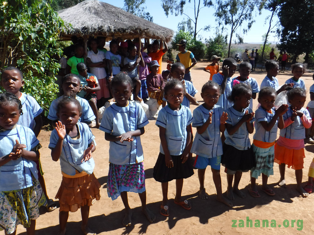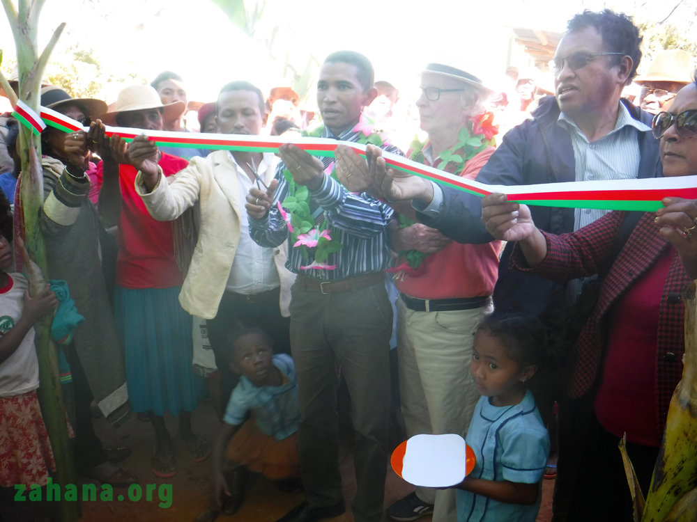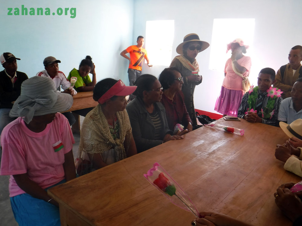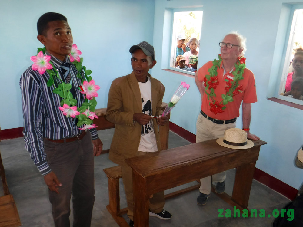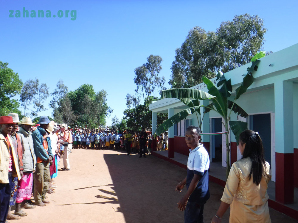 Second aspect: Our second school building in 2019 was constructed and paid for by a French NGO. The founder Abel Legendre of the Association Pour que Vive Maroala attended the inauguration (with the white hat). Zahana was charged with buying the furniture and school supplies in addition to paying our teachers. We are very pleased at this collaboration and synergy that Zahana makes possible. This is the first major contribution by another donor for education, one of our core pillars of Zahana’s development philosophy. The same NGO also generously built the CARMMA, our maternal health focused health center in Fiadanana in 2014. The community got a beautiful, brand new second school building, without too much impact on our Zahana budget.